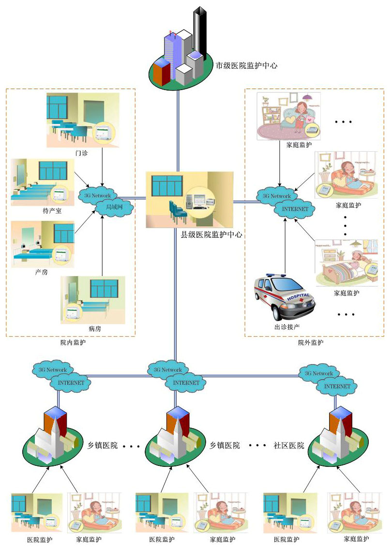 無線遠(yuǎn)程母嬰監(jiān)護(hù)網(wǎng)絡(luò)系統(tǒng),可同時(shí)將縣級(jí)醫(yī)院與多家鄉(xiāng)鎮(zhèn)醫(yī)院、社區(qū)醫(yī)院及家庭進(jìn)行聯(lián)網(wǎng),孕婦在鄉(xiāng)鎮(zhèn)醫(yī)院、社區(qū)醫(yī)院及家庭監(jiān)護(hù)的心電、血壓、血氧飽和度、脈搏心率及胎兒的瞬時(shí)胎心率、宮縮壓力、胎動(dòng)等參數(shù),同時(shí)無線遠(yuǎn)程實(shí)時(shí)傳輸?shù)娇h級(jí)醫(yī)院,實(shí)現(xiàn)遠(yuǎn)程監(jiān)護(hù)、遠(yuǎn)程診斷,不受時(shí)間空間距離制約。對(duì)同一個(gè)醫(yī)院,可實(shí)現(xiàn)門診、監(jiān)護(hù)室、病房、分院、樓層距離遠(yuǎn)聯(lián)網(wǎng)需求和資源共享。