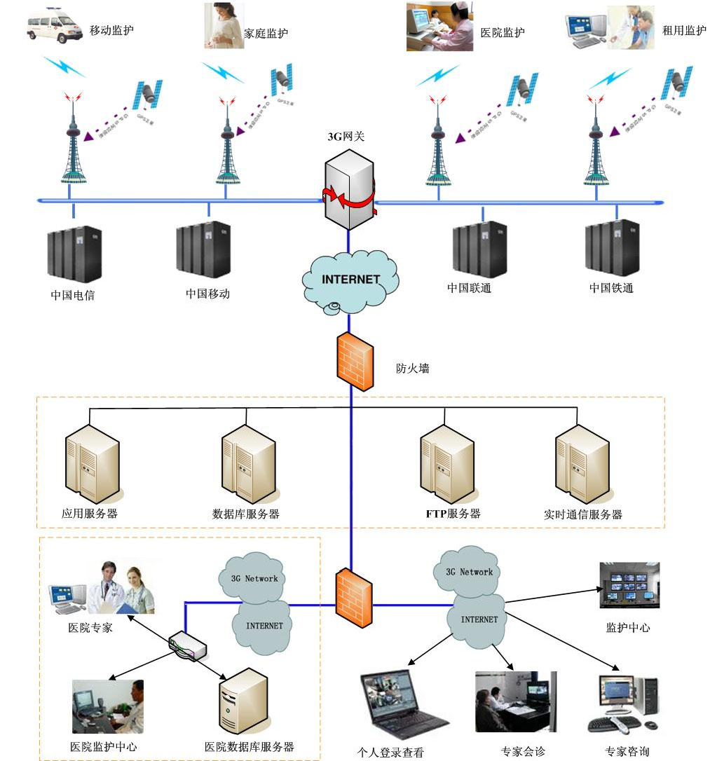 整個(gè)系統(tǒng)有遠(yuǎn)程監(jiān)護(hù)網(wǎng)絡(luò)服務(wù)器集群、遠(yuǎn)程監(jiān)護(hù)工作站、若干監(jiān)護(hù)終端及各種應(yīng)用軟件及數(shù)據(jù)庫管理軟件組成。遠(yuǎn)程監(jiān)護(hù)網(wǎng)絡(luò)服務(wù)器集群提供監(jiān)護(hù)信息實(shí)時(shí)遠(yuǎn)程傳輸、分析、存儲(chǔ)及數(shù)據(jù)庫管理等后臺(tái)軟硬件技術(shù)支持和服務(wù),對(duì)用戶不可見。