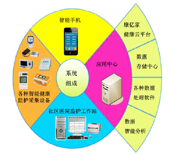 系統(tǒng)主要有各種智能健康醫(yī)療設(shè)備采集終端、智能手機(jī)客戶端、社區(qū)醫(yī)院監(jiān)護(hù)系統(tǒng)工作站、康億家智能健康云平臺(tái)等應(yīng)用平臺(tái)組成。